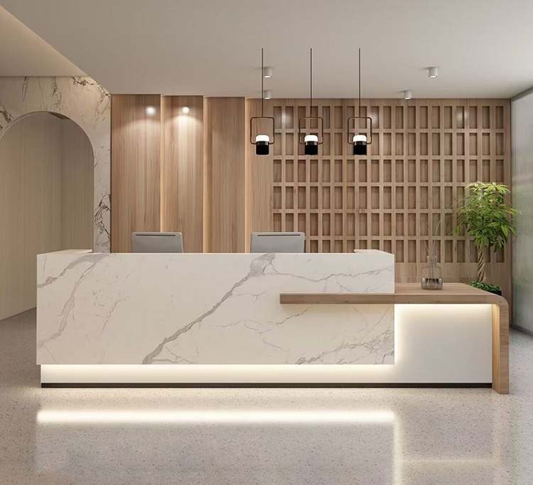Quầy lễ tân ốp đá kết hợp gỗ hiện đại – Nét phóng khoáng, tươi mới cho không gian sảnh sang trọng .