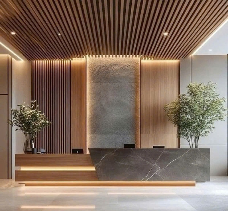 Thiết kế quầy lễ tân bằng vật liệu gỗ và đá giúp quầy lễ tân sang trọng hơn